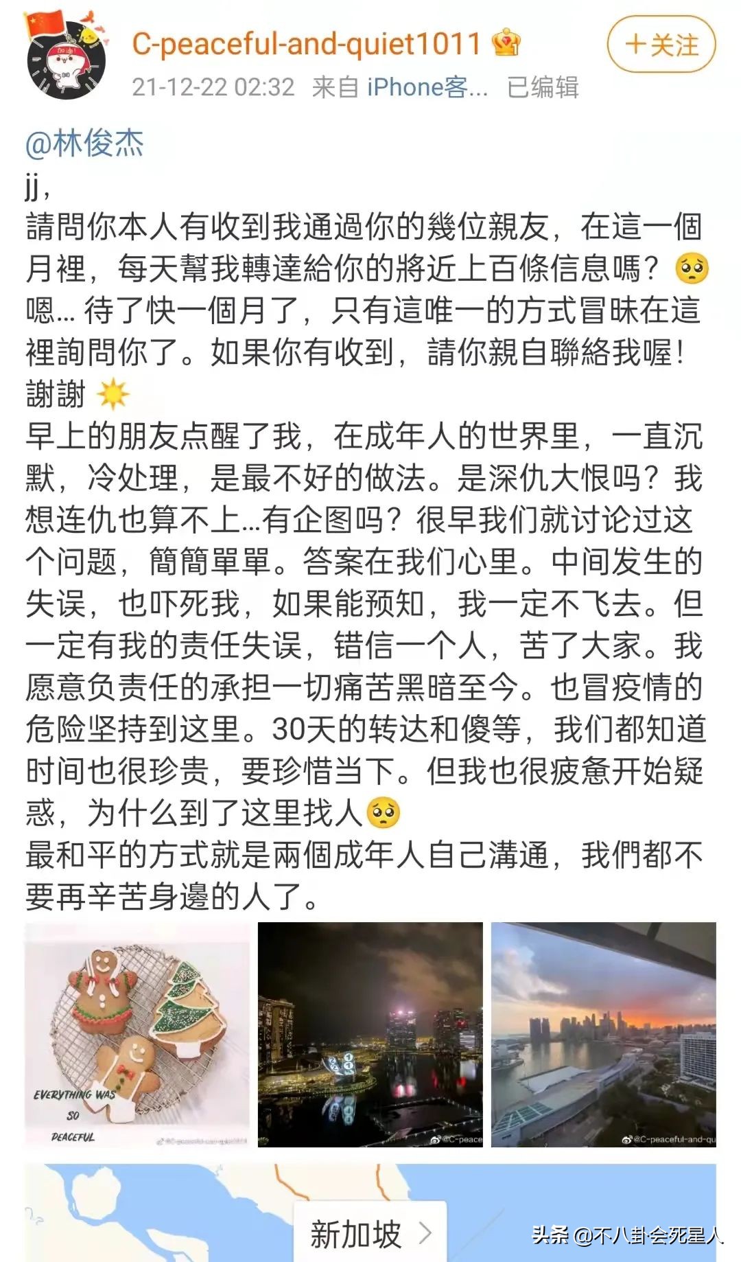這一切都要從一個網友的發文說起,該名網友寫長文,表示自己現在在新加坡,「待了快一個月了,30天的轉達和傻等」,因為聯絡不上林俊傑,只好公開喊話,希望借助輿論的力量,找到林俊傑。從文章來看,她和林俊傑疑似存在感情糾紛。