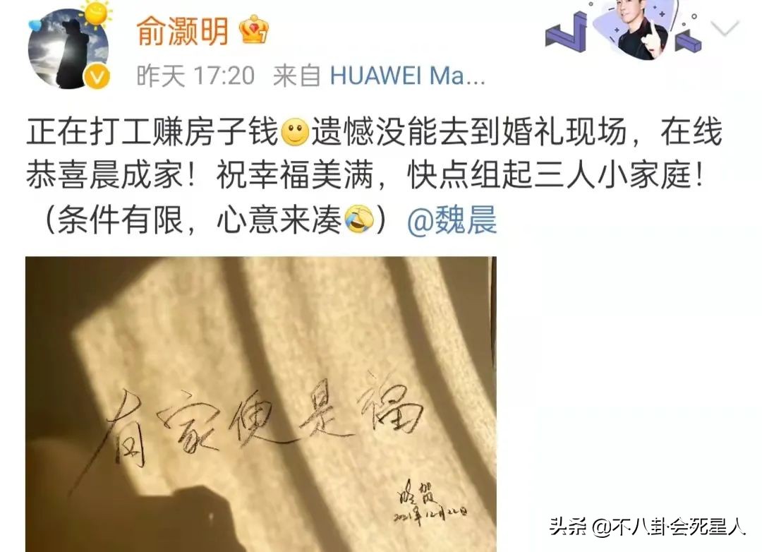 作為魏晨的好朋友,俞灝明也是必須要提的。他手寫五個字:「有家就是福」,祝賀魏晨。並很遺憾沒能去現場,還表示正在打工賺房子錢。
