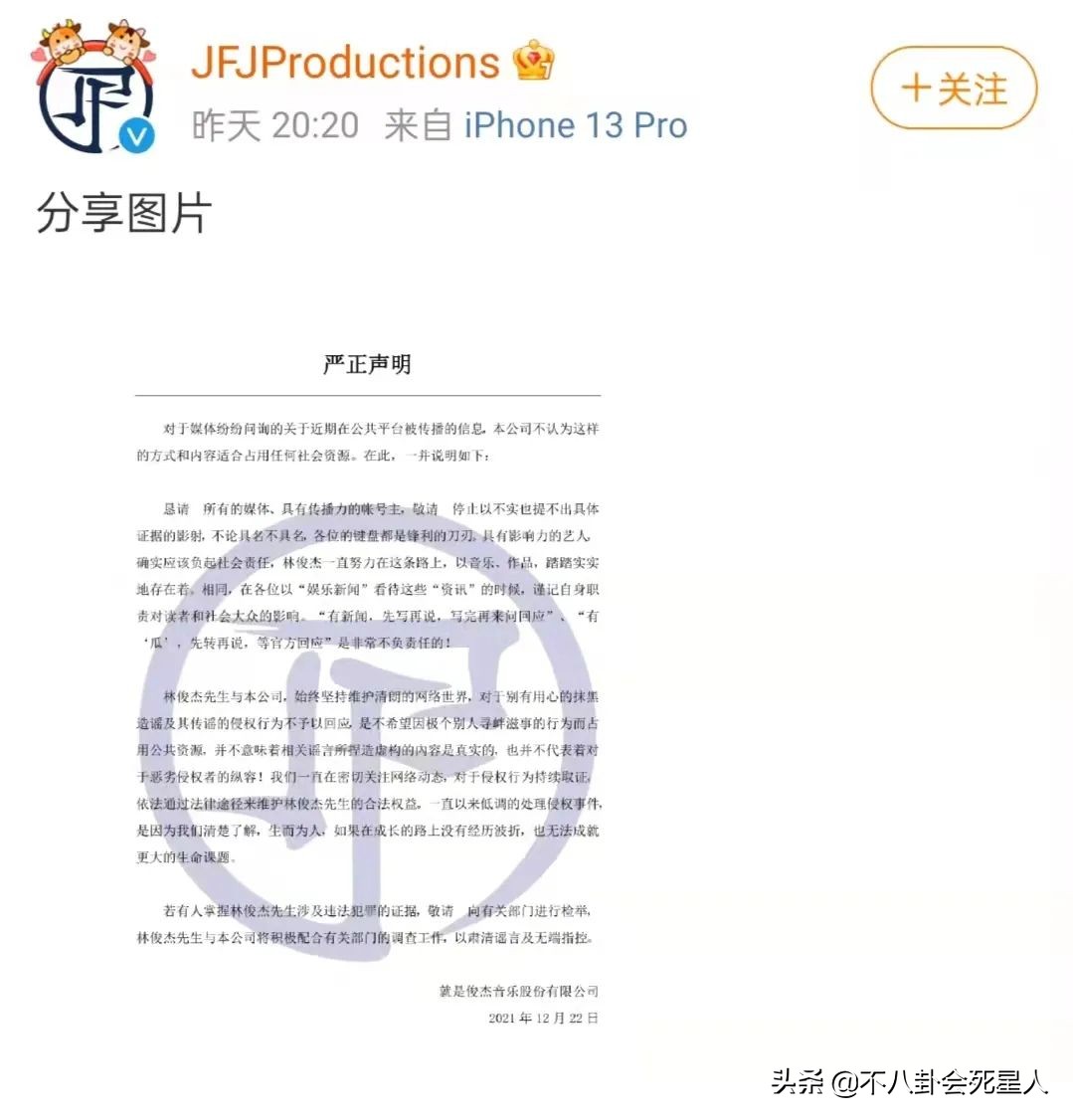 林俊傑工作室發布聲明,表示網上的喊話,是有人在刻意抹黑造謠,已經侵犯到林俊傑的權益,他們會配合有關部門的調查,肅清謠言。