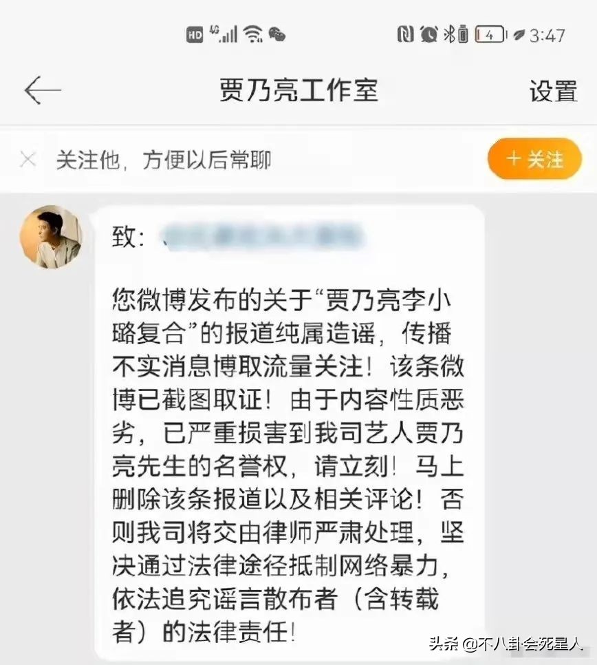 對此,賈乃亮工作室給予否認,還讓po文的人立即刪除,否則將通過法律方式維權。