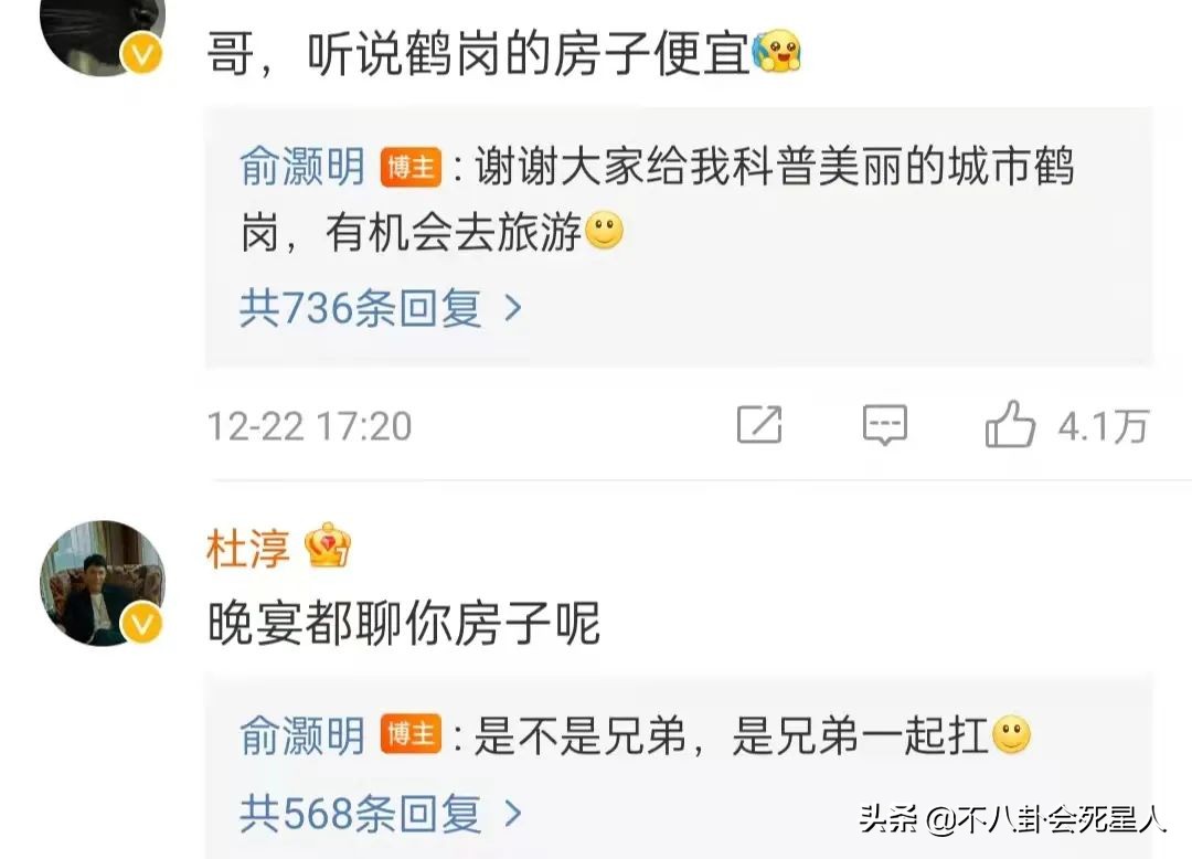 評論區也是很逗,網友建議俞灝明看看鶴崗的房子,杜淳也來湊熱鬧,說:「晚宴都聊你房子呢」。