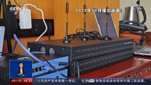 視訊畫面顯示4月13日,山東臨沂警方在一家賓館內,對正在連通GOIP設備為上遊電信網路詐騙分子提供幫助的犯罪嫌疑人李某江實施抓捕的畫面。此次行動中,警方當場查獲作案工具GOIP發射器一臺、手機卡39張、流量卡5張、平板電腦一臺、無限數據終端一個、記錄本一個、空卡套38張。