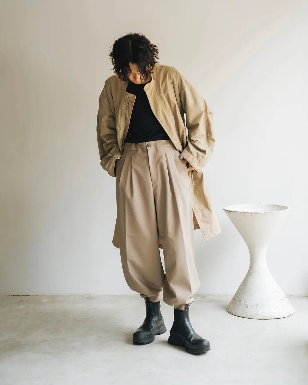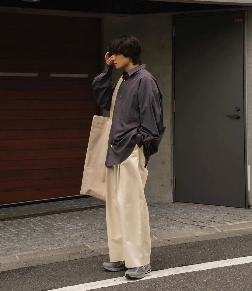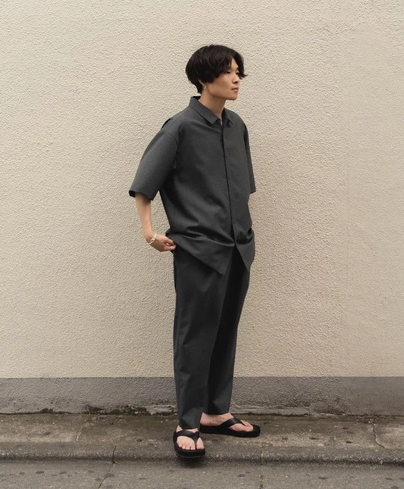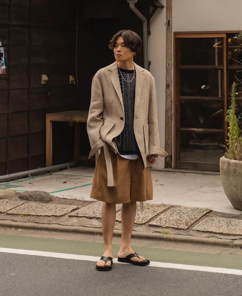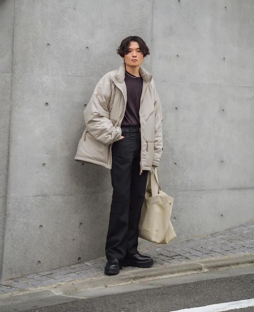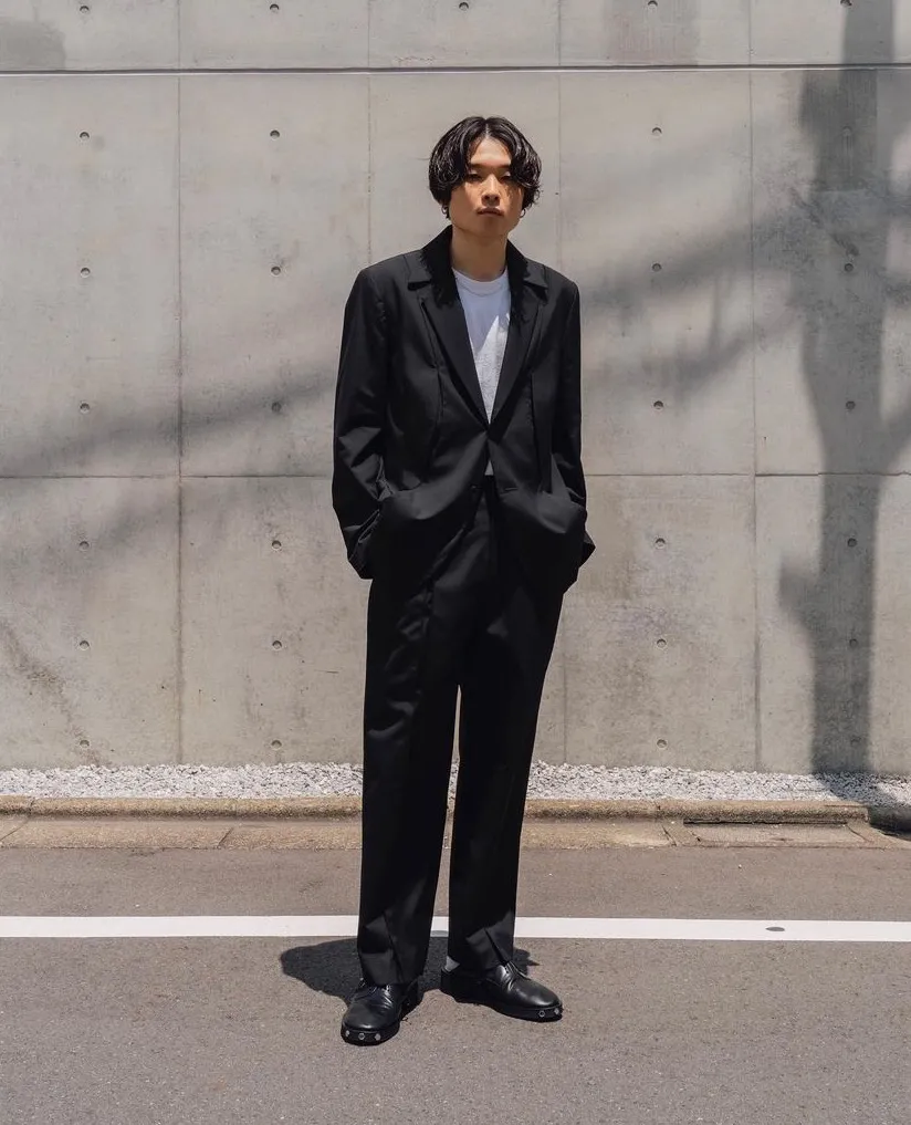 不知道是不是受到 kiko kostadinov 的影響,越來越多的人喜歡上這種厚重的圓頭皮鞋,而高島涼用一條寬鬆的西裝長褲,上半身則選了一條清新的米白色外套作為外搭,輕鬆緩解了下半身的累贅感。
