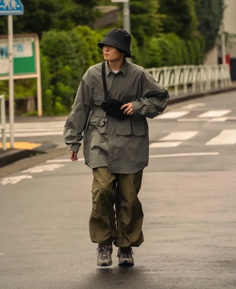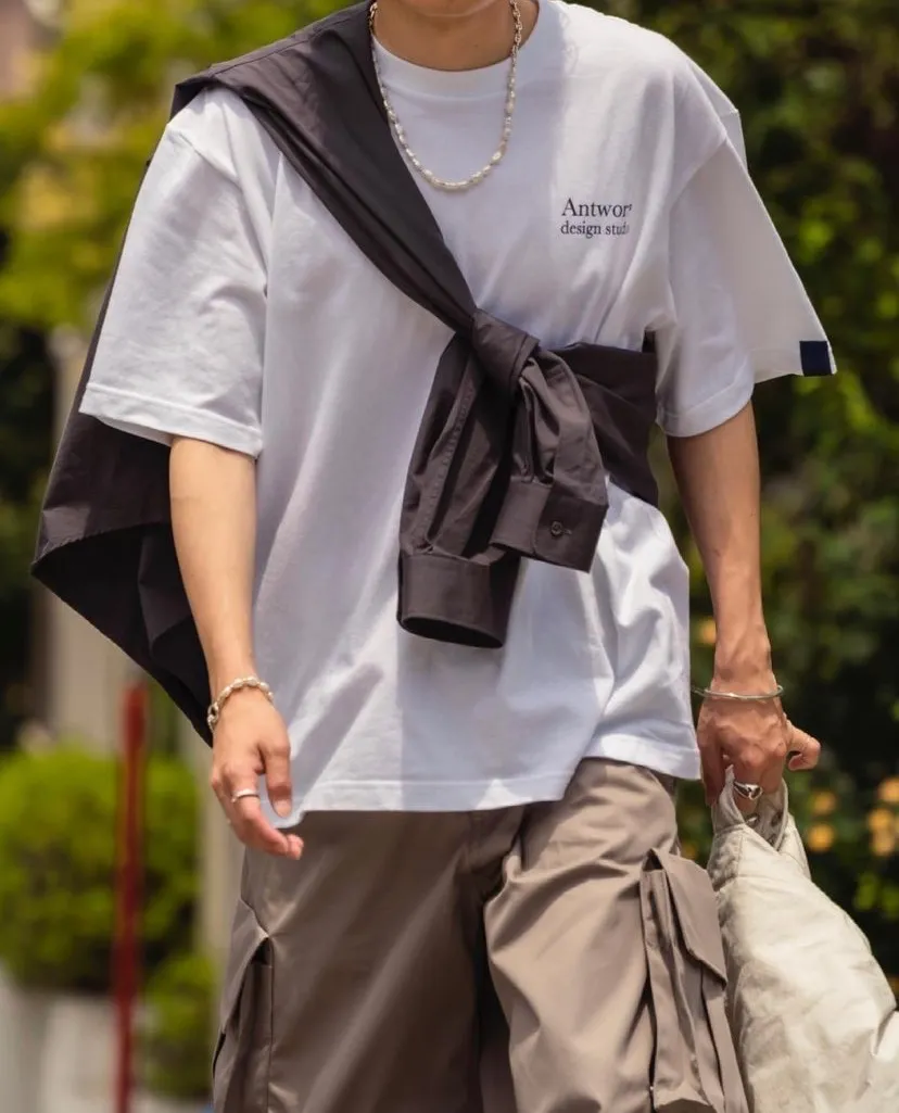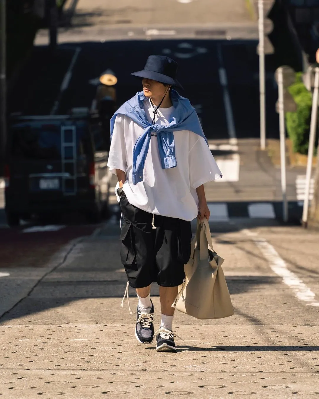 區別於普通的將襯衫系掛在肩上,高島涼還將襯衫斜掛在了身上,乍一看以為是背了一個單肩包,但也給整體的搭配增添了許多隨意感,不會覺得做作。