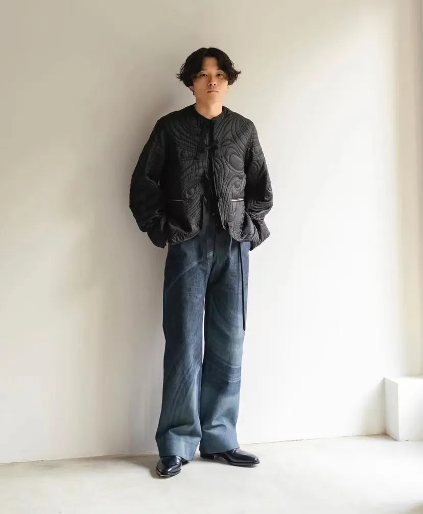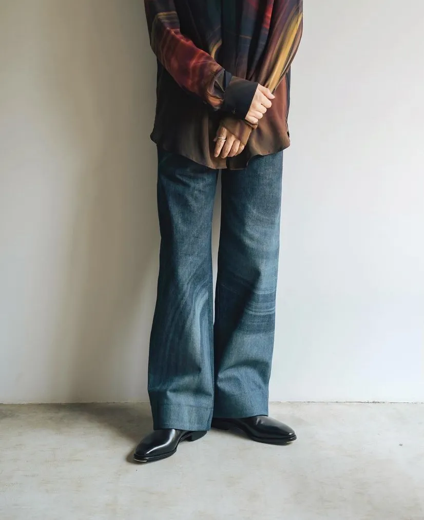 Calmanthology 一貫極致簡約的設計,而高島涼用一條有些微漸變的闊腿牛仔褲改過鞋面,再用一條油畫元素的襯衫,整套穿搭就有一種中世紀的優雅感。