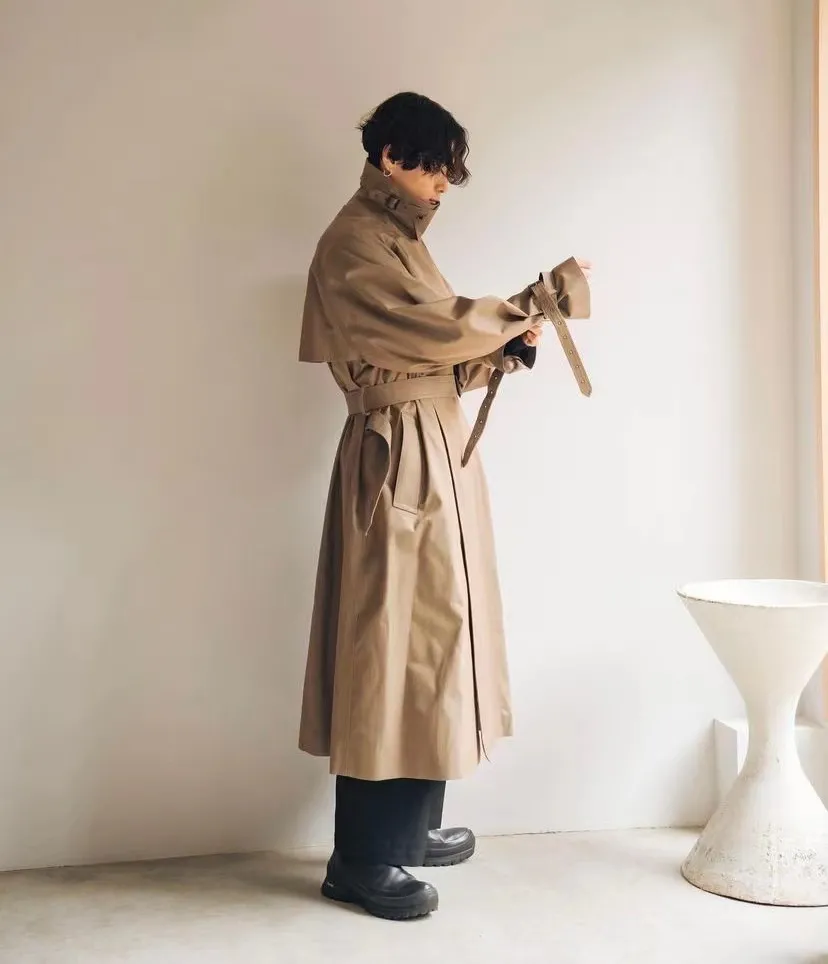 日韓的男性,都很喜歡這種直接蓋到小腿的長風衣,搭配一雙圓頭的皮鞋,就不會有腳重頭輕的感覺了。