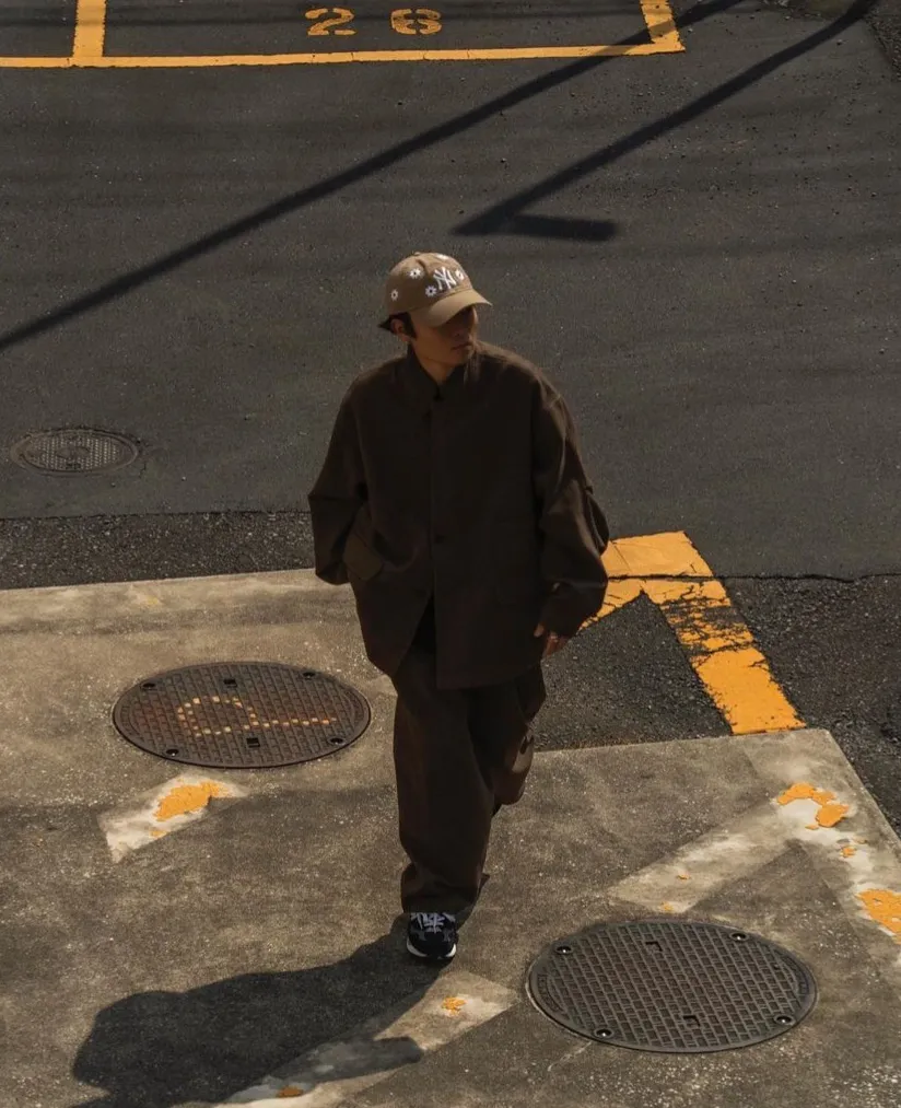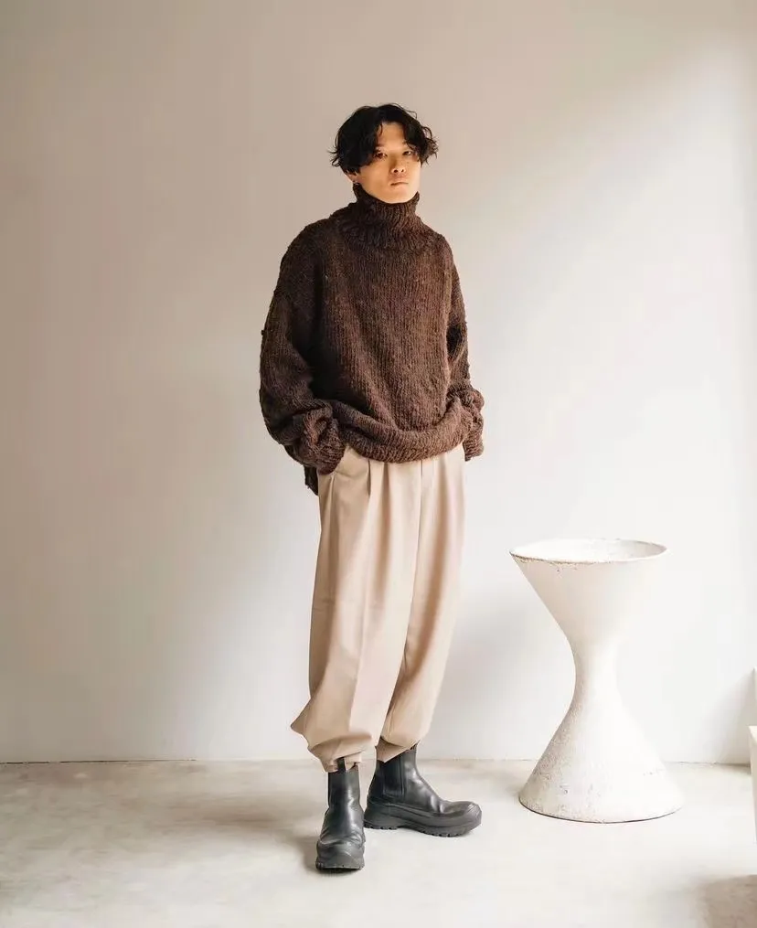 同樣是上下同色系,深棕色的感覺就更適合秋冬,有一種靜謐,神秘的感覺。這是高島涼在顏色上的講究,也是大多數不喜歡花裡胡哨顏色的男性可以嘗試的風格。