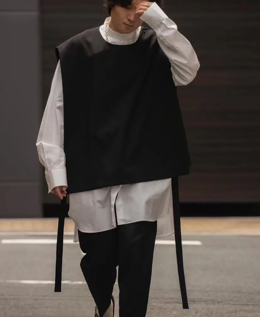 並且用一個馬甲作為外搭,對於肩膀不夠寬的男性而言也是一個不錯的遮蓋缺陷的方式。