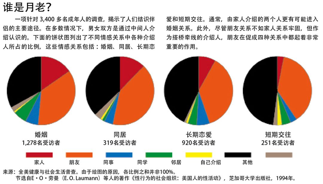 參考一下有關人們如何結識伴侶的統計數據。1992年,全美健康與社會生活普查 (也即廣為人知的「芝加哥性調查」)在全美國範圍內抽取了3,432名年齡介於18~59歲的成年人進行調查,得到了關於美國人在愛情與性行為方面最全面最精確的一組數據。調查的內容包括伴侶選擇、性行為、心理特征、健康狀況等詳細資訊,還包含一組罕見的數據:人們是在哪裡、怎樣認識現在的性伴侶的。在許多情況下,不管男女雙方處於何種情感關係,他們的初次見面都是由第三方介紹的。