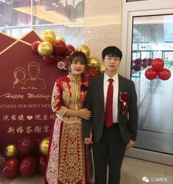 新郎沈雍捷在接受採訪時表示,夫妻倆在南通大學上學時是同班同學,畢業後,通過一位親戚介紹確定戀愛關係,今年5月底訂婚。