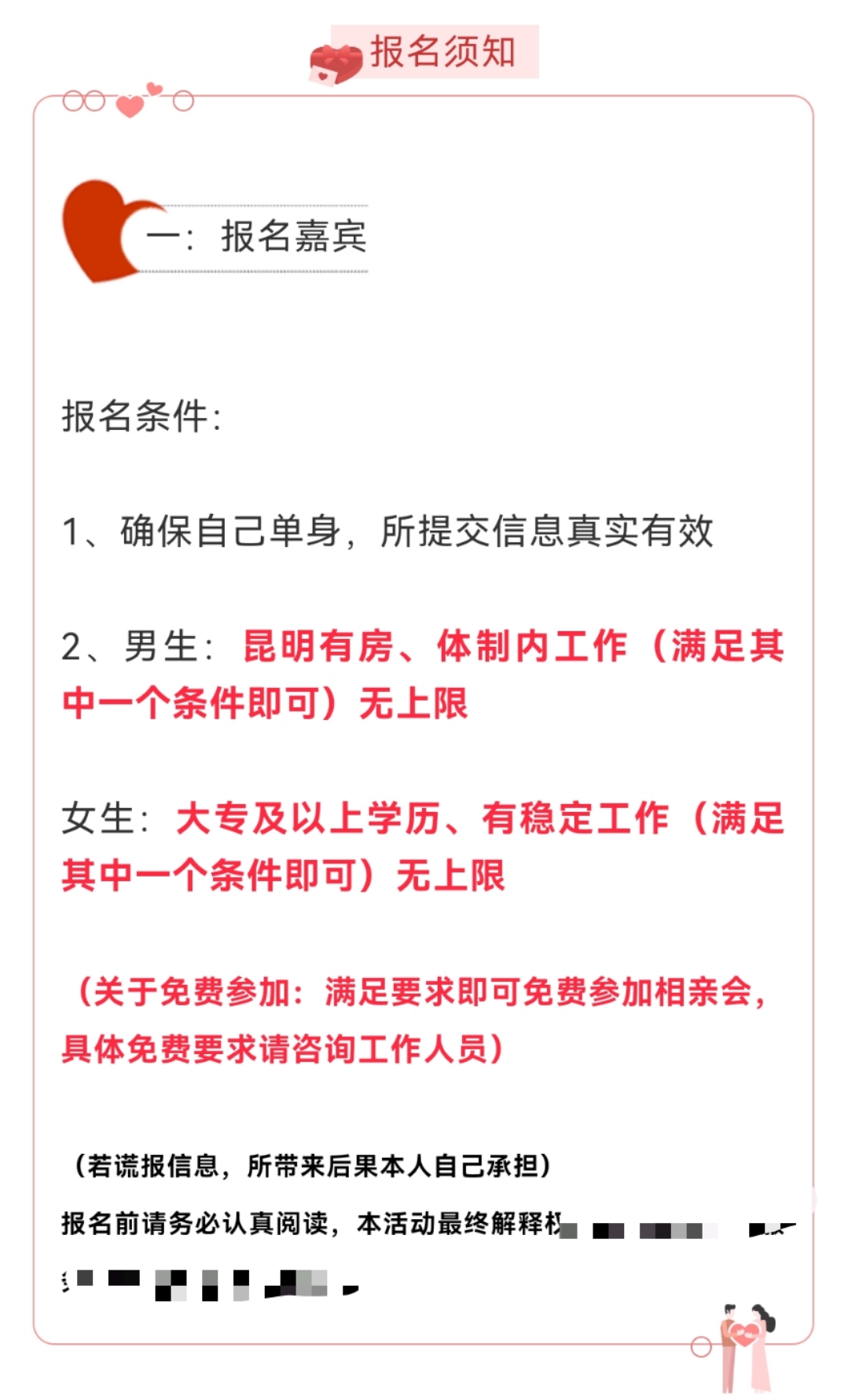 「80後、90後都有,男生、女生數量對半,也有很多是父母來報名的。」昆明某婚介所的工作人員小王說,「很多選擇來婚介所的人都是非常焦慮的,都希望我們能快速幫他們找到對象。」小王認為,會員們過於衡量相親對象的條件,需要在每個條件都合適之後才願意進一步了解對方,這是導致焦慮的一個主要原因,因為遇到完全符合期望的人是很難的。「婚介公司會不定期舉辦付費相親活動,門檻不高,大家都可以報名參加,但是相親的成功率不高。」此外,小王也提醒,很多婚戀機構和網站並不正規,誘導用戶大量繳費後「解鎖」優質相親資訊,不少急於求成的用戶都會「上套」,「消費者非常容易受騙上當,甚至會泄露個人隱私,大家一定要小心。」