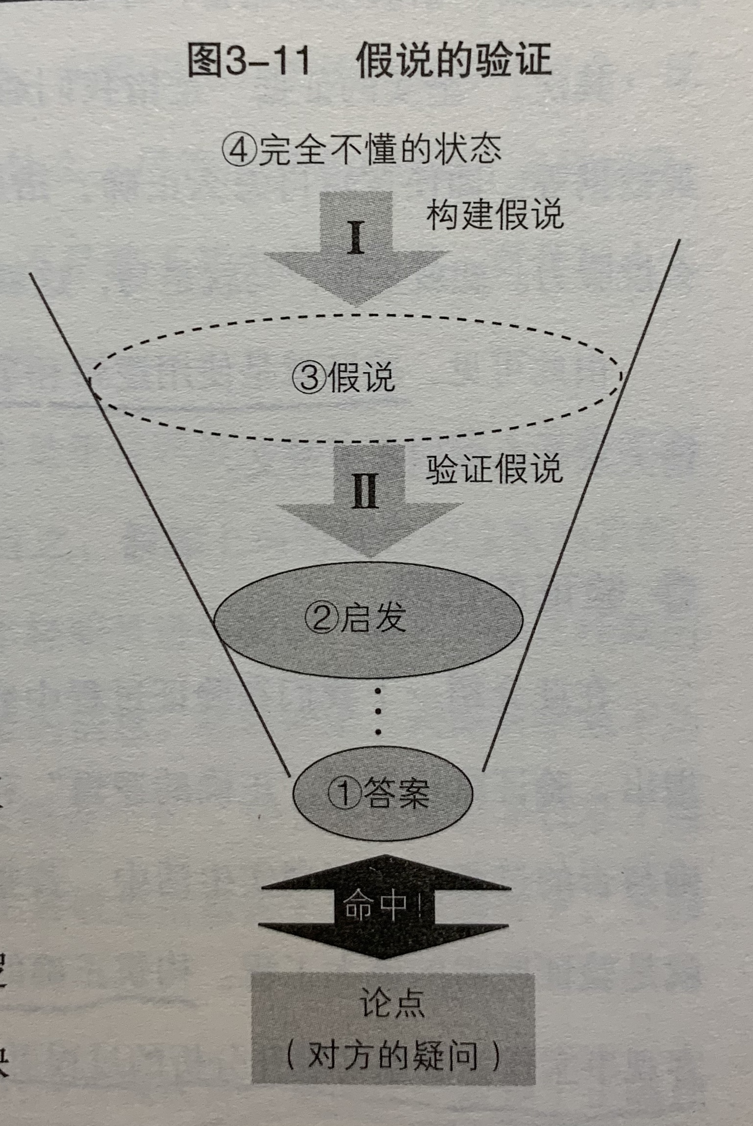 除了構建邏輯,還要站在對方的角度設想問題,高田貴久將這個動作稱為「驗證假說」,通俗的講,就是首先找出對方可能提問的問題,查明論點,然後推測出可能的答案,最後找到客觀證據來證明自己的答案。高田貴久把這一系列的過程分出了五個步驟,分別是: