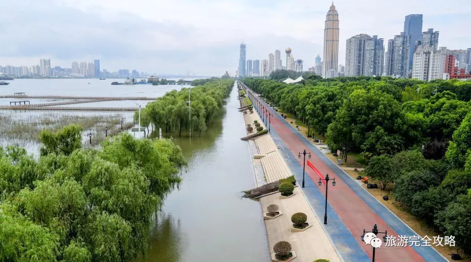 武漢臨江大道是武漢市主幹道之一,從武漢長江大橋下魚貫而過,臨江大道含包全部武昌江灘,長江觀景第一臺正好位於該大道正中央。每年初夏,武昌江灘合歡樹都會開出粉色如雲的花朵,它的含義是「永結同好」,你可以和TA站在樹花下,並肩看一場浪漫的日落。
