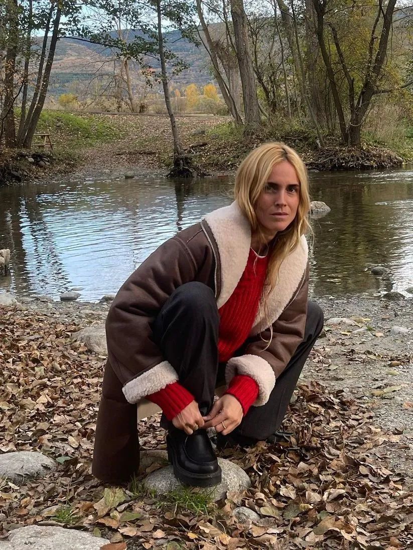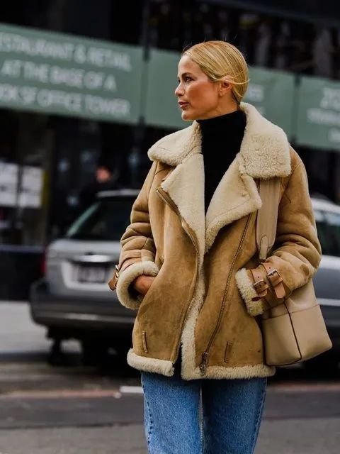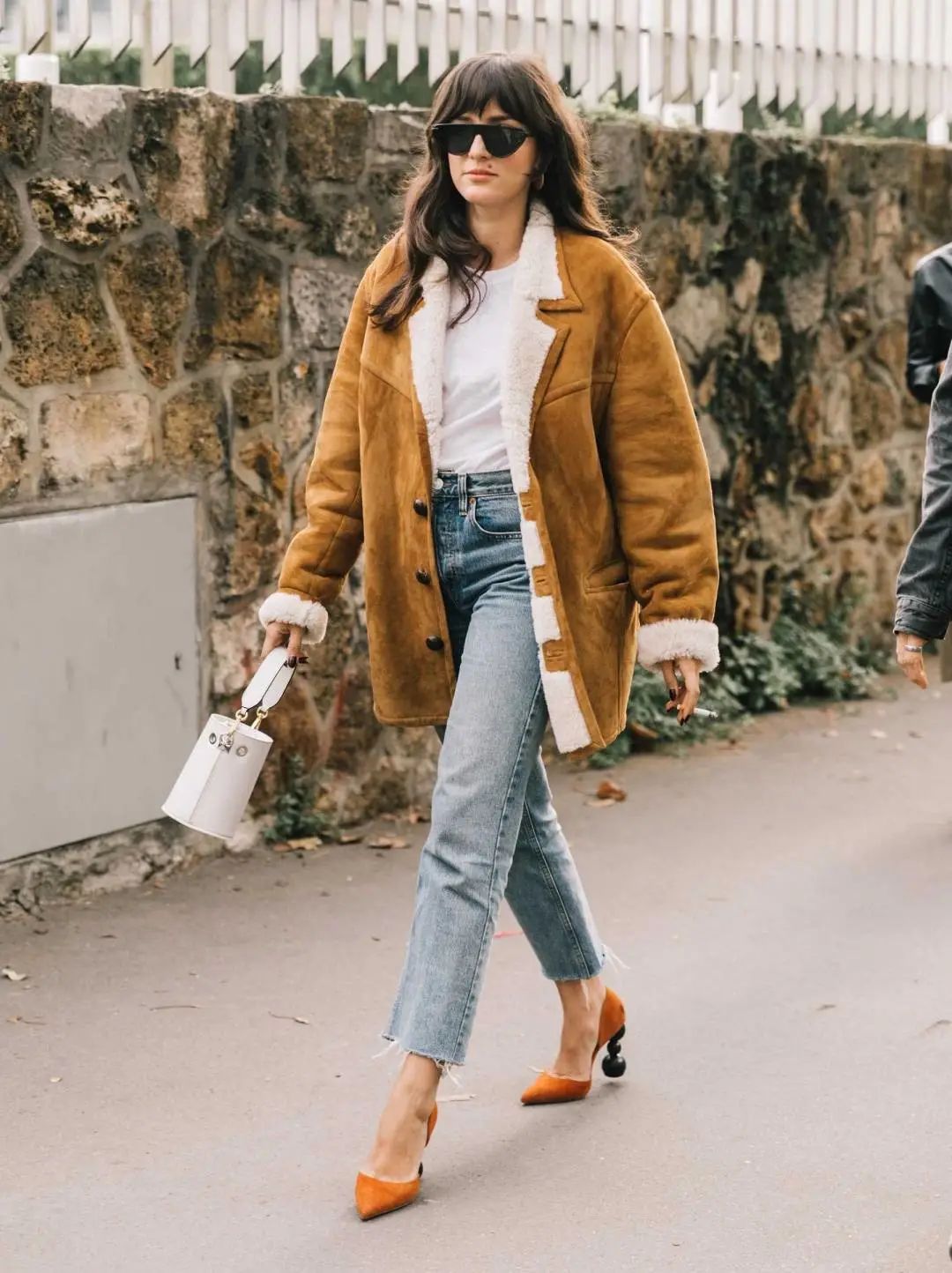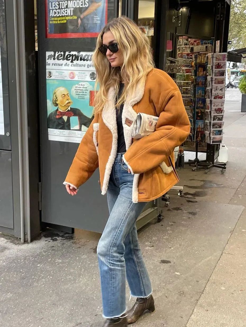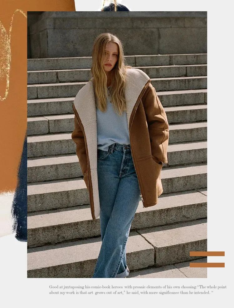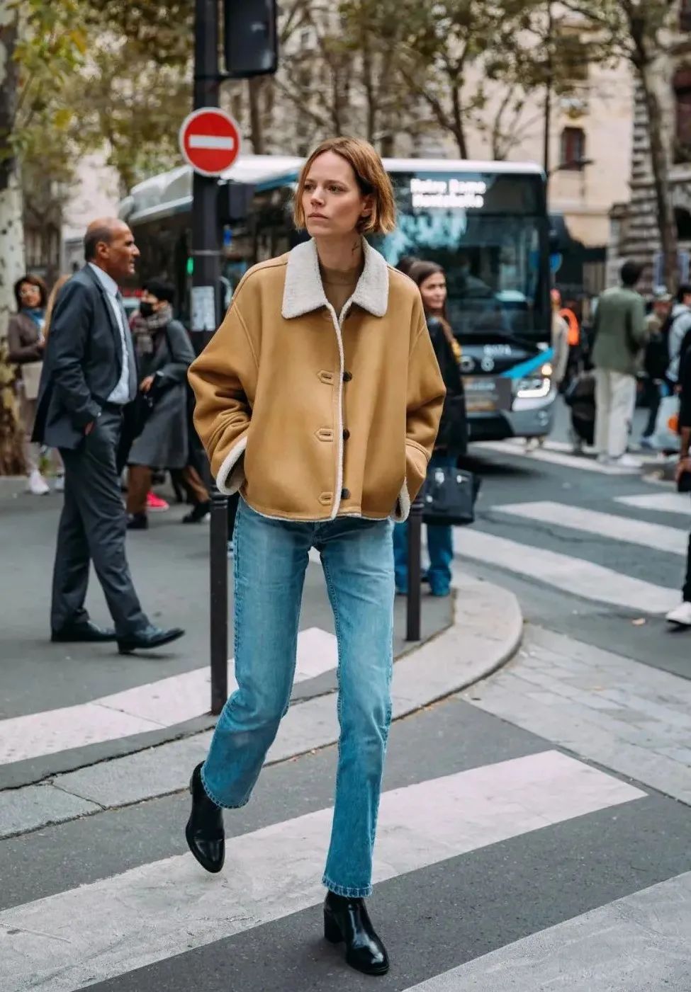 棕色的皮毛一體外套可以搭配藍色牛仔褲,選顏色做舊一點的,會更有復古感。