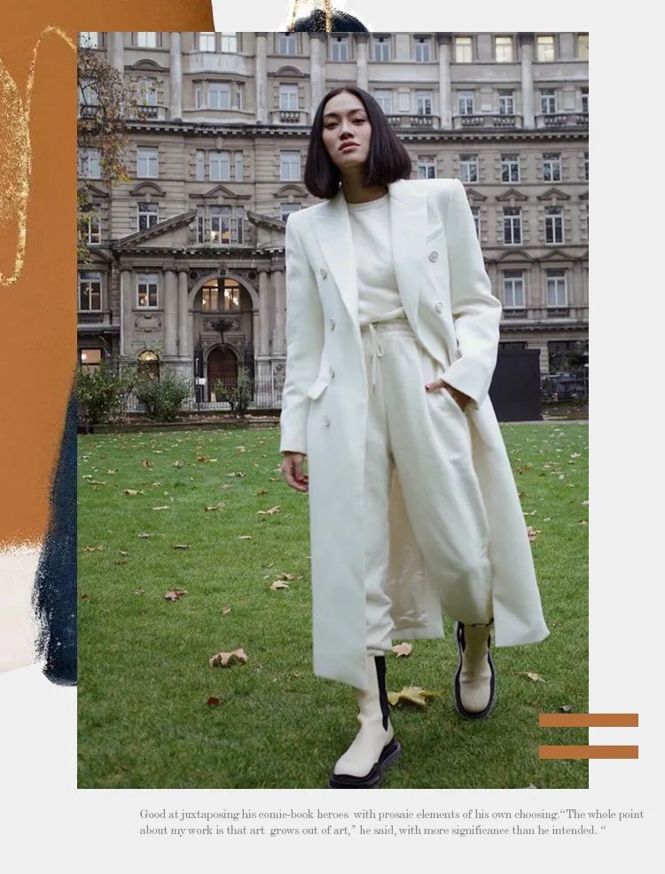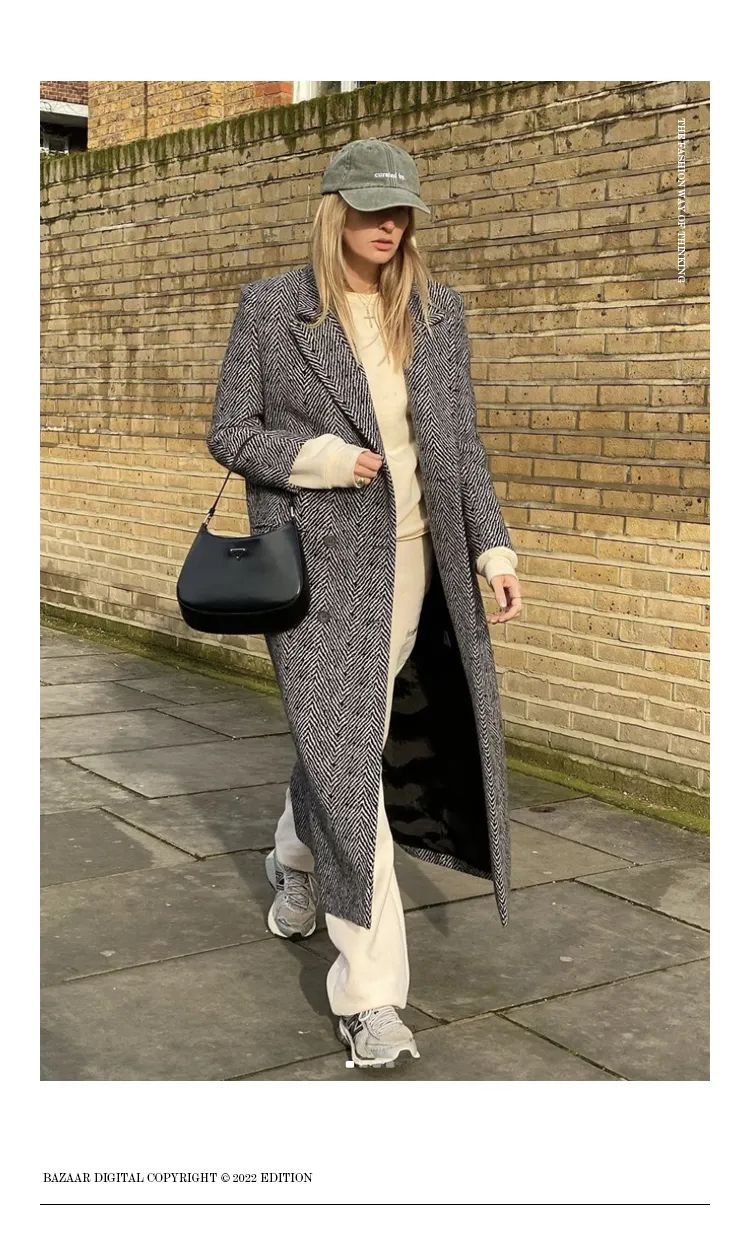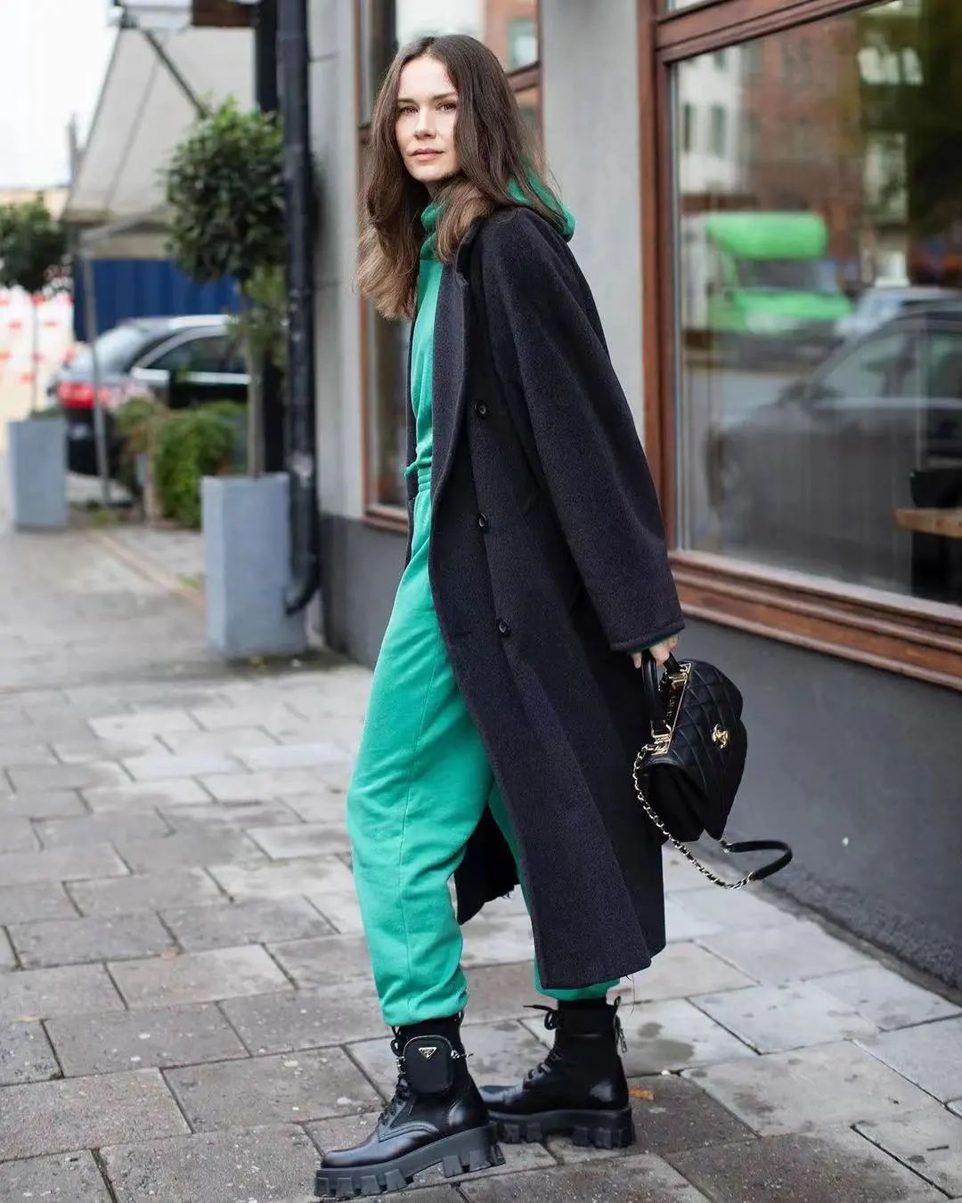 利落的長大衣可以化解衛衣套裝的隨意感,看起來更有精神,即使通勤上班也不會顯得邋遢。