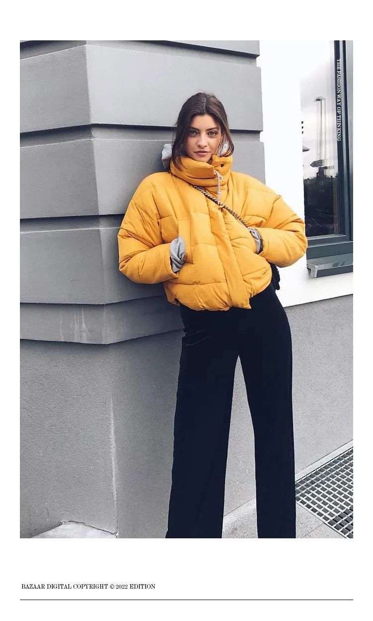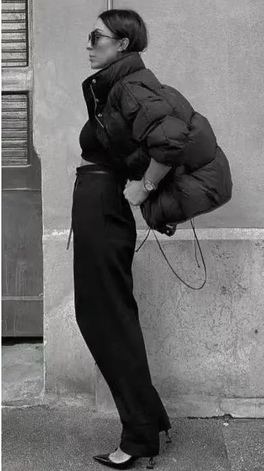 選擇設計相對修身的高腰闊腿褲款式,乾淨利落,不僅不會顯臃腫,反而能提高腰線拉長腿部比例。和短款羽絨服組合,這樣分分鐘穿出胸以下全是腿的既視感。
