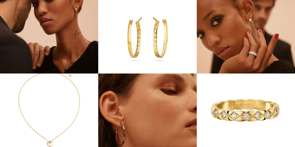 這裡有兩款「出圈」的類型,一是以Chanel Coco Crush高級珠寶系列為靈感的設計,特意以金飾本身塑造不同造型的紋理,以增加摩登與優雅感。一般多用珍珠、閃鑽等材質拼合,能在光的照耀下顯現明顯的閃爍效果。