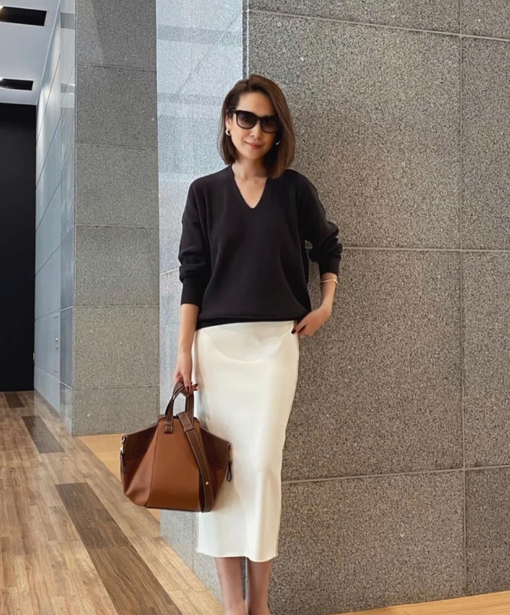 基礎服裝分為很多,這裡先從下裝說起,白色包臀半身裙就是很典型的一大單品,它可以幫助成熟女性透露出很有韻味的身姿,展現出豐腴的美感,不管體型胖還是瘦,穿上這種裙子都能夠強調出十足的女性風采。顏色方面帶來的穿衣限制不多,而且這種單品在很多場合都適用。