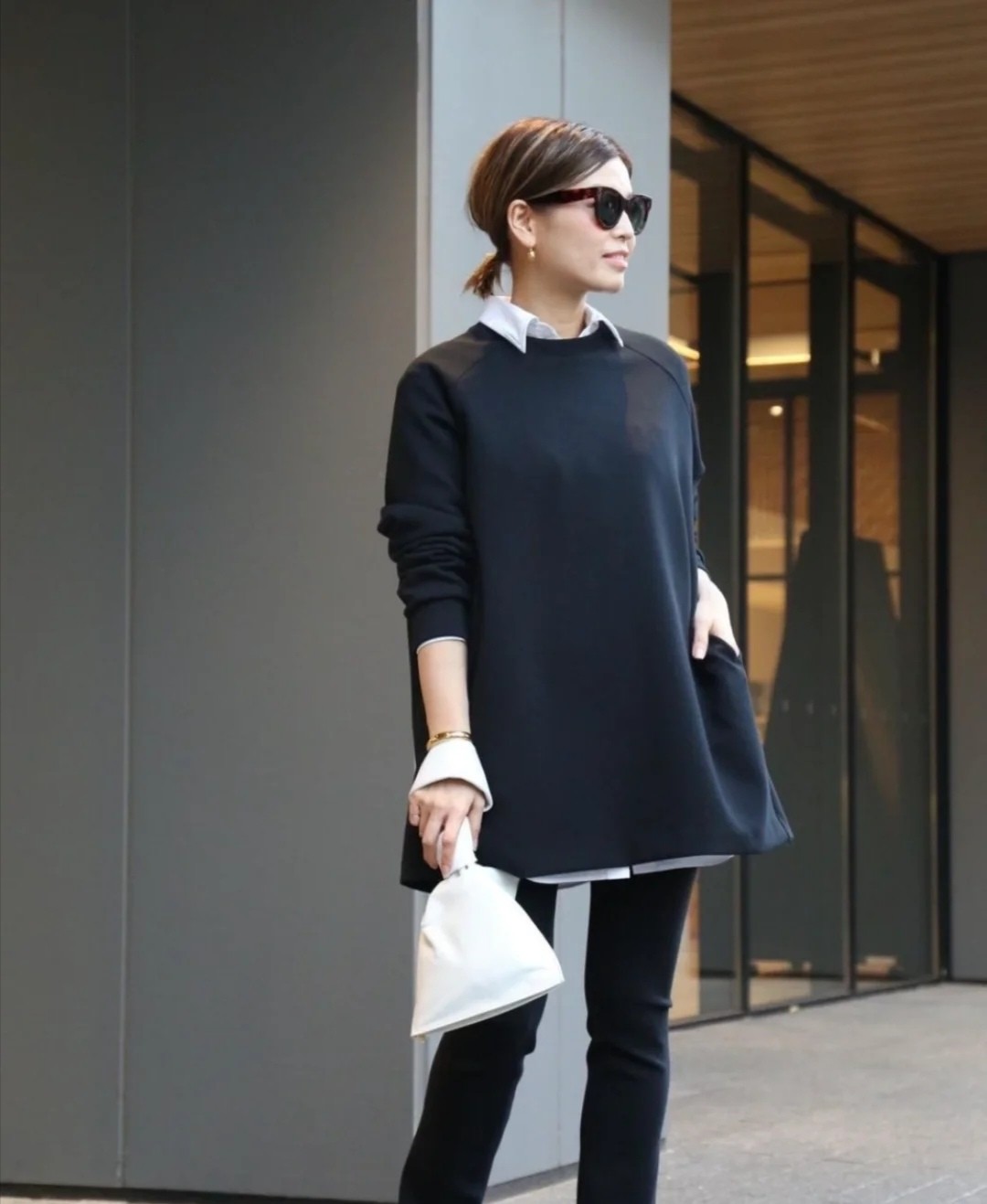 像這套穿搭,利用到的是黑色和白色的匹配,白色占據了小面積的部分,可以形成點綴的作用,防止黑色看起來過分壓抑。白色襯衫作為內搭,可以豐富層次,打造出完整的look。
