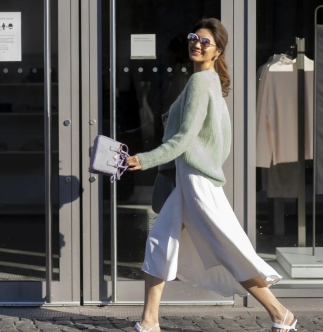 很多女性覺得粉色帶來的減齡作用最顯著,但實際上並非如此,如果駕馭不好粉色,反而會體現出一種廉價的質感,放大年齡感。清新的顏色才擁有弱化年齡的功效,以藍色和白色為主要代表,在春天嘗試這樣的色彩,也能讓個人的精氣神更足一些,精神面貌更好。