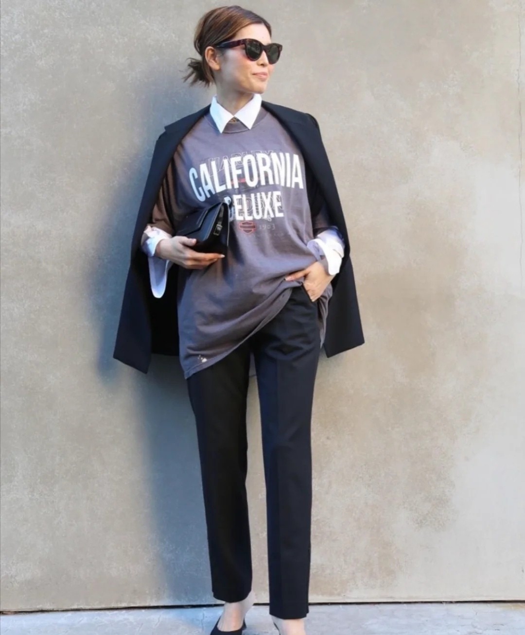 可以將外套和褲裝都採取黑色,這樣上下之間彼此呼應,色彩更完整,內搭以白色或者是淺灰色為主,這樣的色彩組合會和諧很多。而且顏色對年齡的要求並不高,展示出濃濃的高級感。