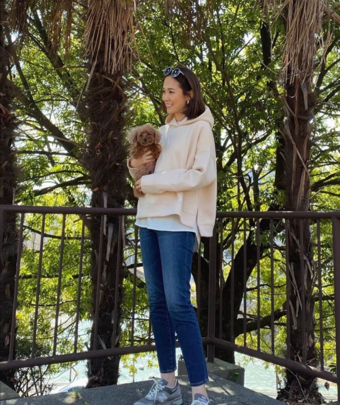 好比這條藍色牛仔褲,它是緊身褲的裁剪,因此身材好的女性穿上它以後,則會讓自己的優勢展現得清楚很多。如果是身材變胖的五十歲的女性,她們可以換成稍微包容腿型的直筒褲,減齡的效果一樣明顯。