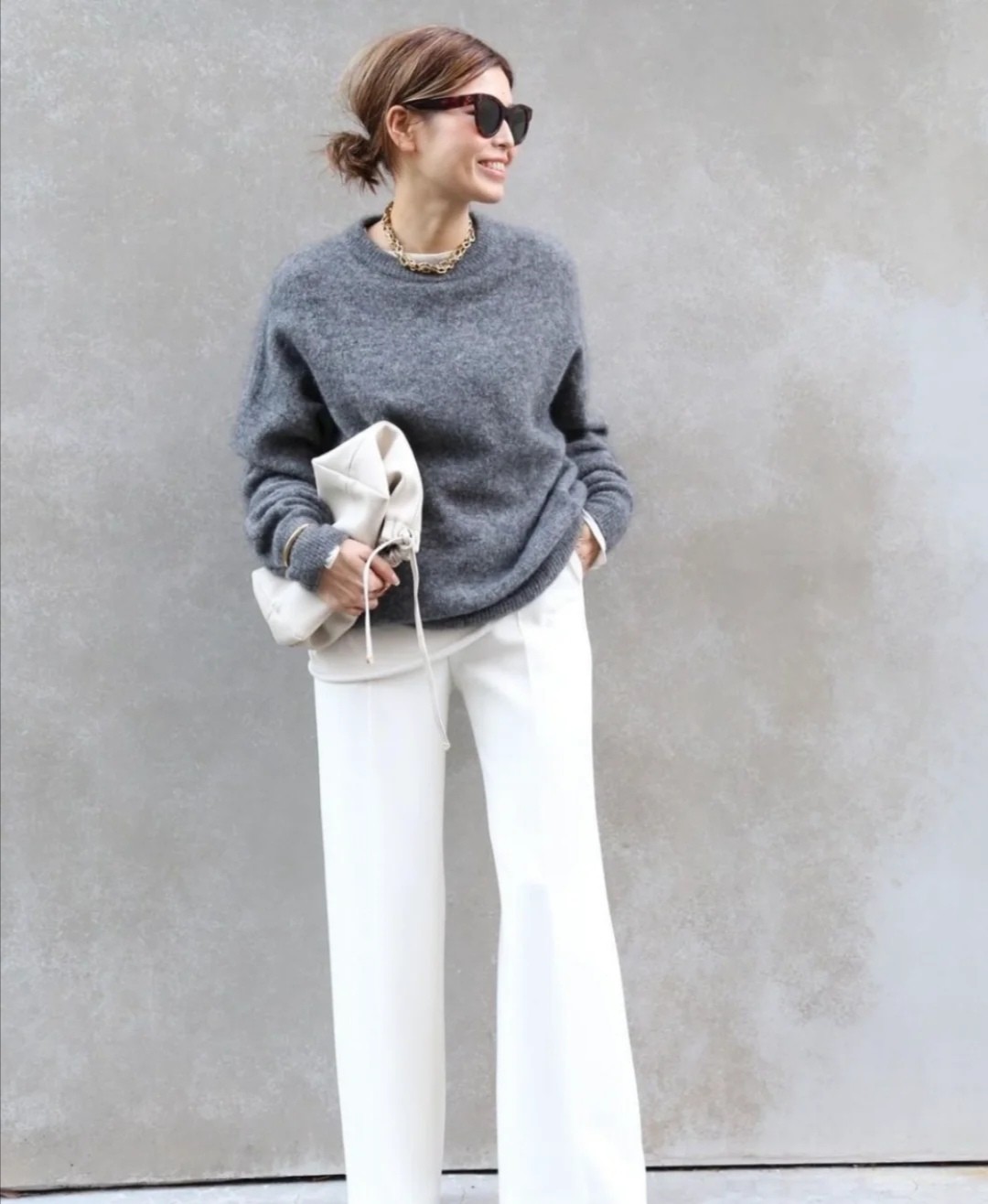 好比這組穿搭中利用到的白色長褲,垂感很好的褲裝,可以達成對腿型的極致的優化作用,而且呈現出來的氣場也很明顯。上半身結合的單品樣式別太長,短長之間的組合,才能夠盡可能地讓個子不高的女士收獲美觀的體型。