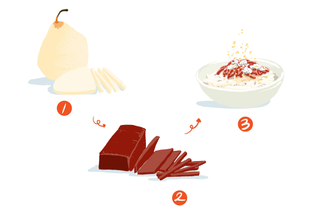 1. 雪花梨去皮切小指寬的粗條,泡冰水備用;