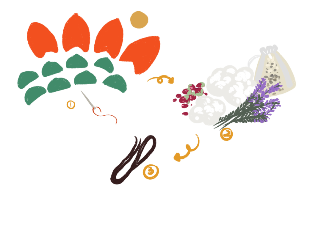 2. 填充棉花放入薰衣草、玫瑰花、七裡香各10g(或其他草藥香草);