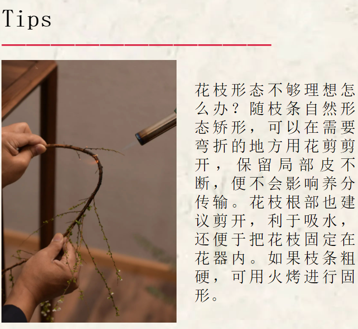 木本枝材在插花時可以將底部剪十字口,草本花材則剪成斜面,以增加花材的吸水面積。
