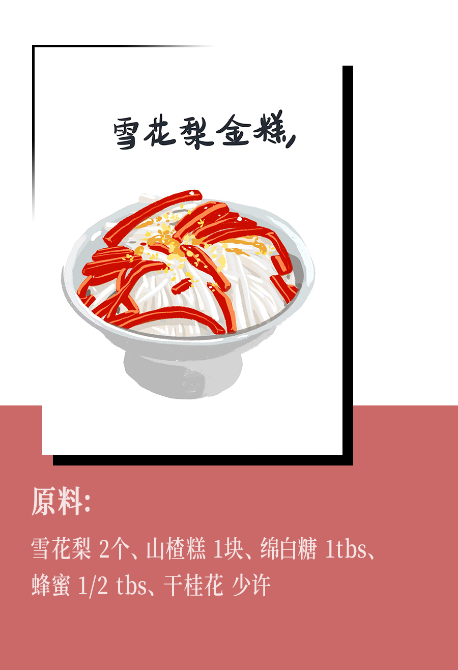 2. 山楂糕切成與梨同等大小;