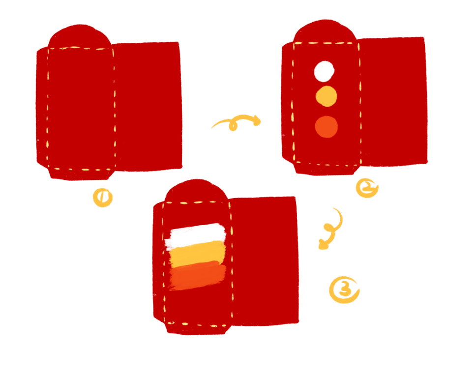 1.將橙色、黃色、白色的丙烯顏料擠在紅卡紙上一字排開;