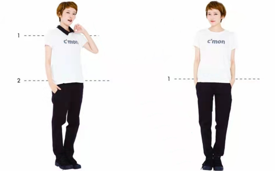 對比左右圖,僅僅是多了一個黑色領口,瞬間生動立體,與小黑褲呼應,還承接著上半身的焦點。沿用這個思路,我們可以靈活變通。