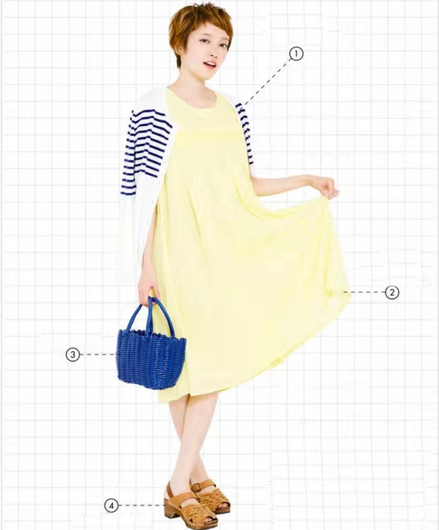 條紋,具有說一不二的主角特點。它的風頭遠遠蓋過深藍色包包。讓它成為肩膀有力的個性依托,還怕黃色裙子不好看嗎?這套搭配引入了2個主角元素,之前分享過,不再囉嗦。