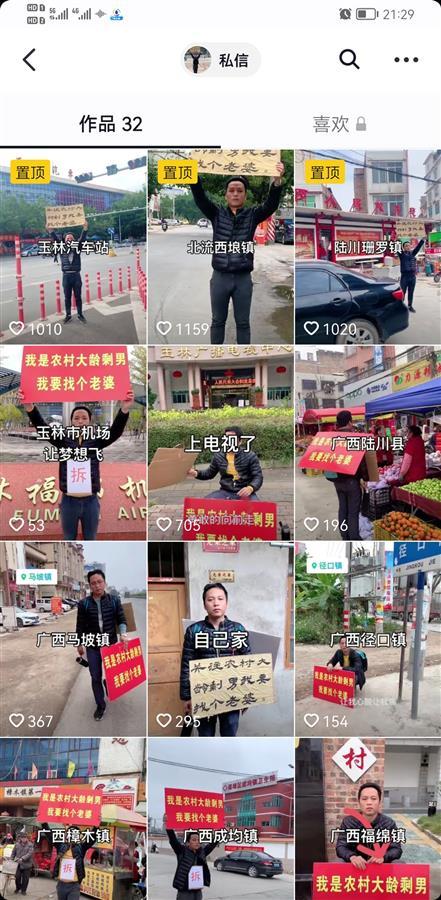 記者看到,在林先生的社交平臺上,他自去年12月23日開始發布舉牌征婚視訊。視訊中,他背著或舉著「我是農村大齡剩男,我要找個老婆」的牌子,走過了玉林的各個縣鎮及一些地標處。他舉牌所到之處,路人紛紛側目。