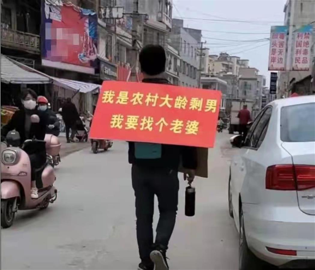 男子背著「農村大齡剩男」的牌子走在街上