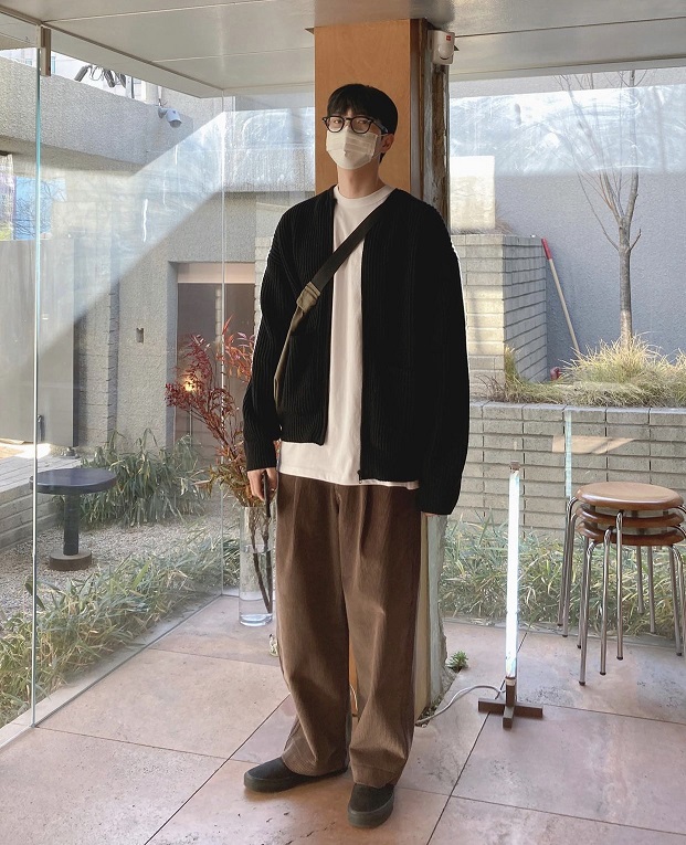 褲裝搭配深棕色的闊腿褲,寬鬆有型的版型對身材包容性極佳,最後利用鞋裝來點綴,整體搭配低調卻又有亮點。