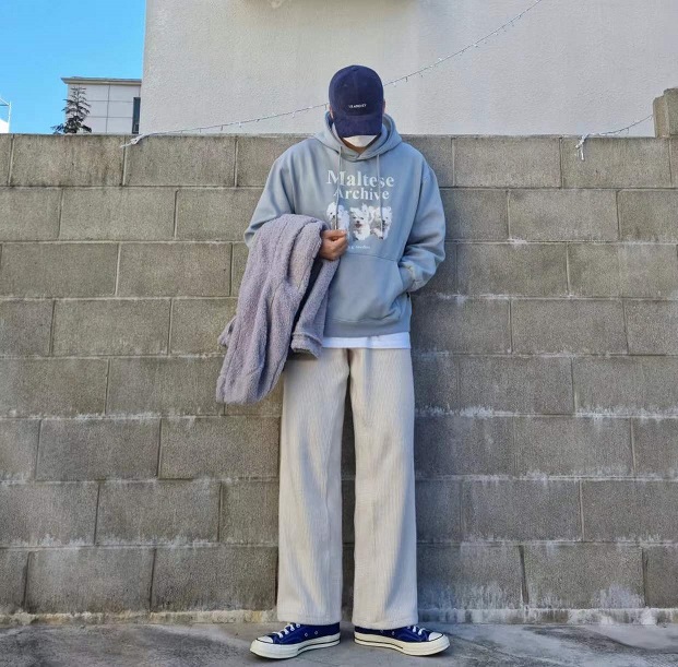 想要帶點溫柔氣質的話,可以試試這件淺藍色印花連帽衛衣,上身之後顯膚白,為了讓搭配更加統一,選擇米白色褲腿褲,不用擔心會顯胖,版型硬挺加上寬鬆褲型,穿上之後更加顯瘦。加上黑色/白色帆布鞋來搭配,輕鬆顯顯年輕!