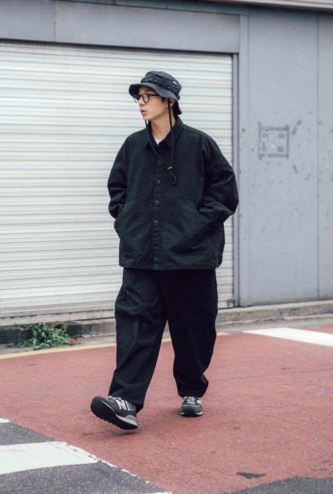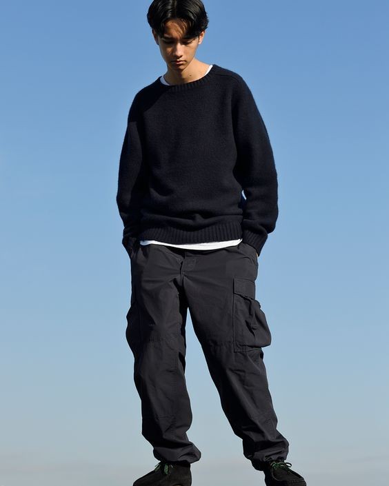 相較於二者,工裝褲往往通體都採用寬鬆的版型設計,掩蓋住腿部線,甚至還要通過標誌性的大口袋設計來增添幾分「膨脹感」。但也不得不承認,工裝褲這一單品是最具減齡效果的,如果你想讓你的黑色調穿搭告別老成與刻板,工裝褲就是不錯的選擇。