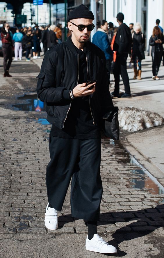 雖然束腳褲與錐形褲具有一定的相似性,都是通過突出纖細的腳踝,來塑造優越身材線條,但束腳褲的褲身更加寬鬆,所呈現出的隨性感與潮流氣息也就更勝一籌。如果你想讓黑色調搭配更多幾分潮酷感,同時又不想太過張揚,就不妨選擇束腳褲。