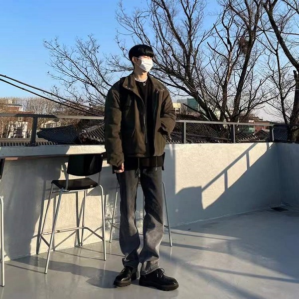 1.軍綠色夾克棉服 + 黑色T恤 + 深灰牛仔褲