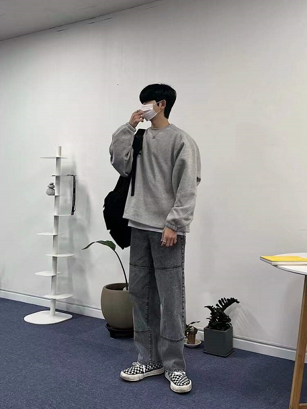 3.淺灰色圓領衛衣 + 深灰色牛仔闊腿褲 + 棋盤格帆布鞋