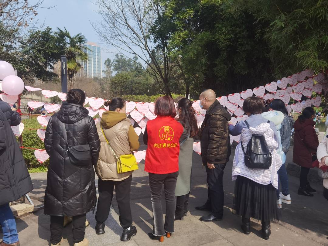 2月13日,情人節前一天,位於內江市東興區大千園的「甜城公益相親角」,一張張粉紅色的相親資料卡掛滿樹梢,吸引了不少單身男女和家長駐足觀看,咨詢填表。