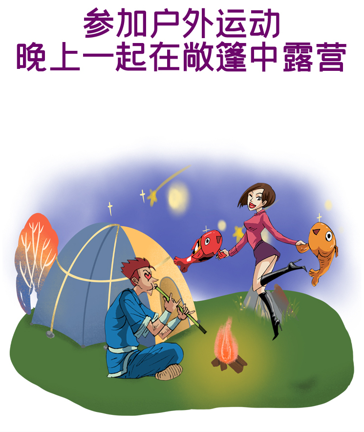 你可以約他參加一次爬山、漂流等戶外運動,最好選擇能生火做飯的地方,一起燒烤吃一次野味就是種不錯的選擇。晚上可以隨驢友們一起搭帳篷露營,這時候在夜色中來一場甜蜜的親吻,會讓戀情更為細水長流。