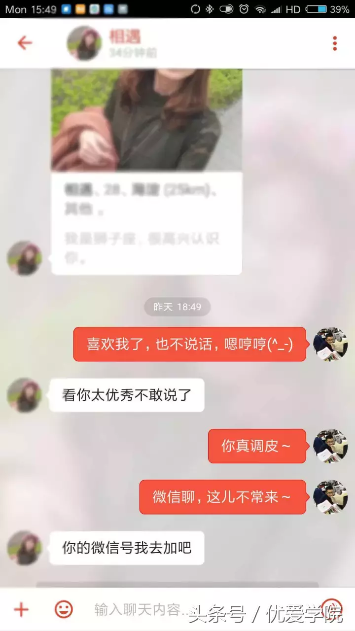 一般男生和女生匹配成功之後,肯定會說:「你好啊美女」等之類的話,但學長肯定不會這樣說,學長這裡用了曲解大法:本來是學長喜歡這種類型的女生,但是被我曲解成「喜歡我了也不說話,嗯哼哼」是不是很有意思?要是你是女生的話,是不是覺得這個男生很有意思呢?