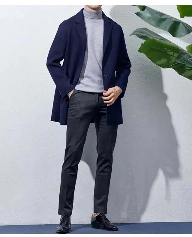 呢大衣也最能展現出男人風度翩翩的紳士氣質,簡約純色系的藍色與灰色呢大衣,搭配高領毛衣和灰色黑色西褲,紳士風度又有溫度
