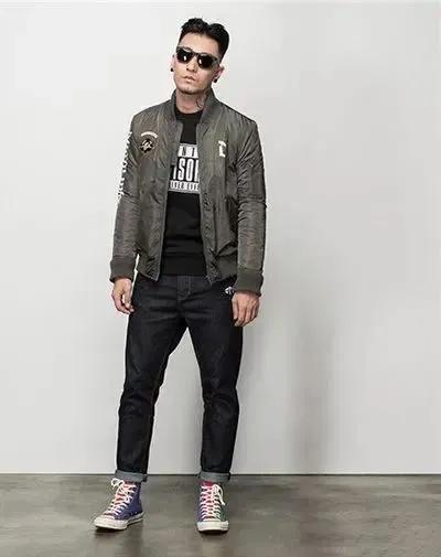 棒球領夾克外套搭配衛衣與牛仔褲,高幫運動鞋。