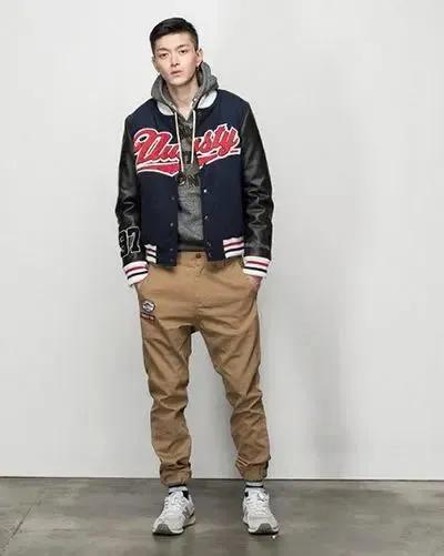 棒球領夾克外套搭配連帽衛衣卡其色束腳休閒褲與運動鞋