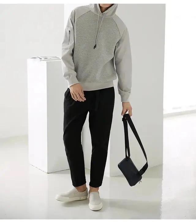 簡約休閒幹練的連帽衛衣搭配黑色休閒褲與休閒鞋
