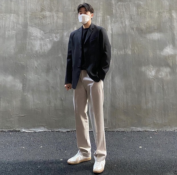 最後拼接板鞋與西裝褲相互搭配,打造出帥氣男友感的隨性搭配。